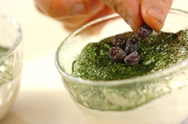 食べる直前に茶こし等で抹茶をふりかけ、甘納豆を飾る。