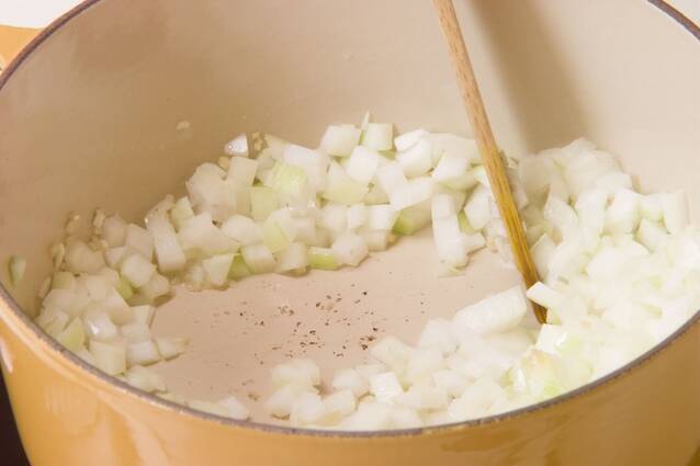 煮込み鍋ににサラダ油、ニンニク、ショウガを入れて中火にかけ、香りが立ってくれば玉ネギを加え、しんなりするまで炒める。