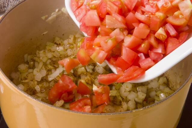 刻み赤唐辛子、チリパウダー、カレー粉を加え、全体に混ざれば、トマトを加えて炒めあわせる。
