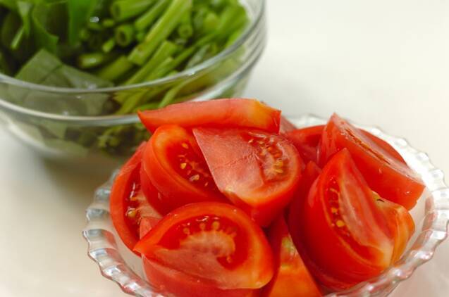 トマトはヘタをくり抜き、8つのくし切りにする。空芯菜は葉と茎に分け、茎は長さ3cmに切る。