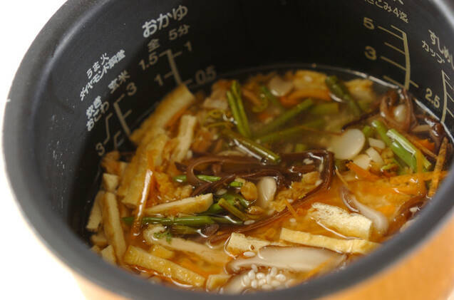 炊飯器に洗ったお米、<調味料>の材料を入れ、通常より少なめの水加減までシイタケと干しエビのもどし汁を加える。山菜、油揚げ、ニンジン、シイタケ、干しエビを加えてひと混ぜし、普通に炊く。