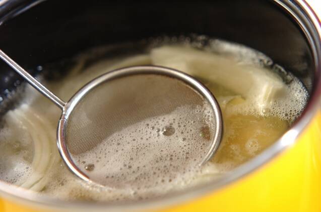 鍋にジャガイモと玉ネギ、だし汁を入れて強火にかけ、煮たったらアクを取り、火を弱めて煮る。