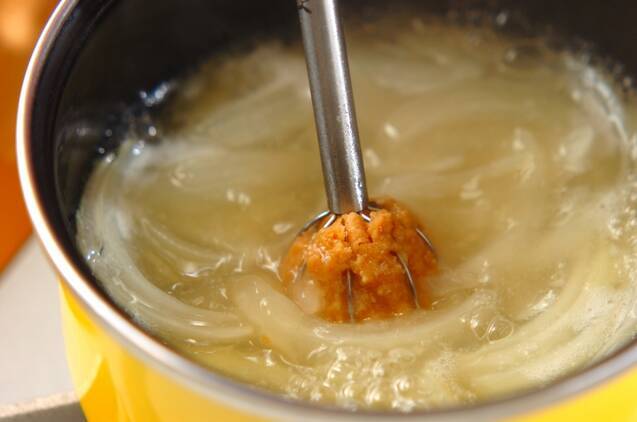 ジャガイモが柔らかくなったら火を止め、みそを溶き入れる。器に注ぎ入れ、刻みネギをのせる。
