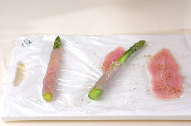 鶏ささ身にグリーンアスパラをのせ、コショウを振り掛けて鶏ささ身で巻く。