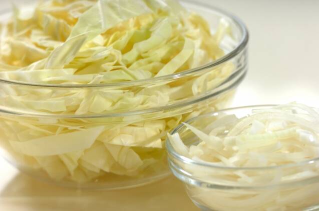 キャベツは太めのせん切りにする。玉ネギは横薄切りにする。