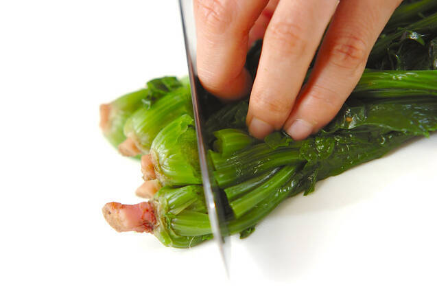 ホウレン草は水洗いして熱湯でサッとゆで、根元を切り落として、幅1cmに刻む。