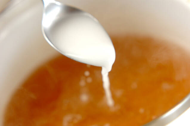(3)の煮汁を沸騰させ、混ぜ合わせた<水溶き片栗>を加えてトロミがついたら火を止める。