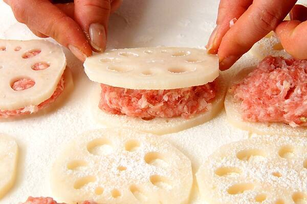 レンコンの水気を拭き取り、片面に薄く小麦粉をつける。合わせた豚ひき肉を、レンコンではさむ。