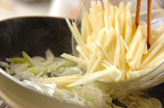 フライパンにサラダ油を強火で熱し、白ネギがしんなりするまで炒め、ジャガイモを炒め合わせる。