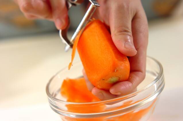 ニンジンは皮をむき、スライサーで縦にスライスする。