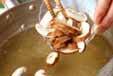 鍋にだし汁を入れて中火にかけ、煮立てば生シイタケを加える。