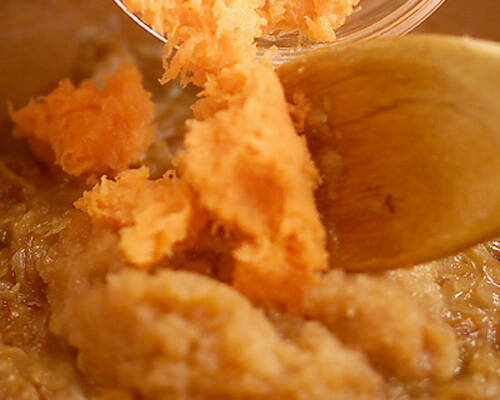 おろしたリンゴとニンジンを加えて更に炒めあわせ、甘い香りが立ってくれば(10~15分)カレー粉を加えて全体にからめる。冷凍保存も2週間OK。