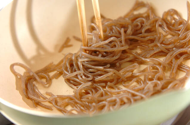 糸コンニャクはザルに上げ、水気をきって食べやすい長さのザク切りにする。鍋にたっぷりの水を加えて強火にかけ、煮たったら1~2分ゆでて臭みを抜く。ザルに上げ、フライパンで乾煎りし、水分を飛ばす。