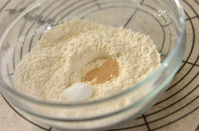 ボウルに強力粉、薄力粉、ベーキングパウダーを入れ、インスタントドライイースト、砂糖を真ん中におく。塩を端におき、温めた水をかけてカードでひとまとまりになるまで混ぜる。