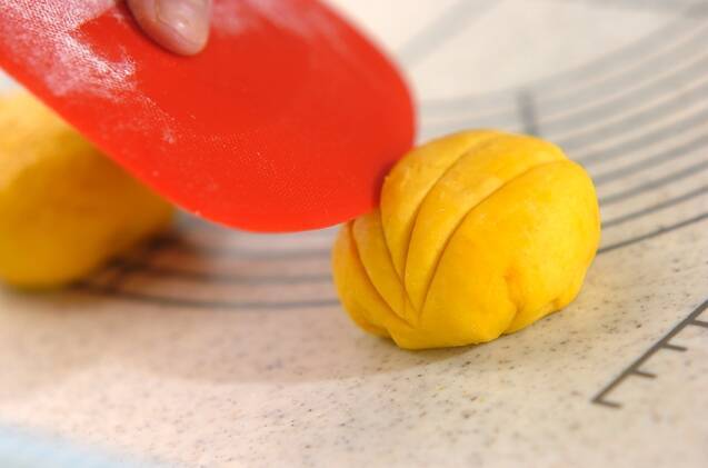 カボチャ生地はとじ目を上にして丸く広げ、<あん2>をのせて包み込む。スケッパーの曲線部分を使って放射線状に4本切り込みを入れる。