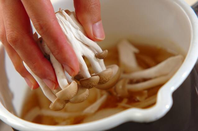 鍋に<スープ>の材料を入れて強火で熱し、煮たったら玉ネギ、シメジを加える。