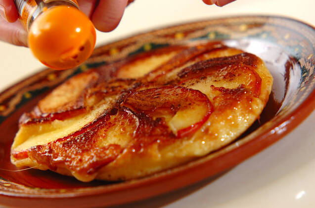 リンゴ全体に焼き色がついたら器に盛り、シナモンパウダーを振る。同様にもう1枚作る。