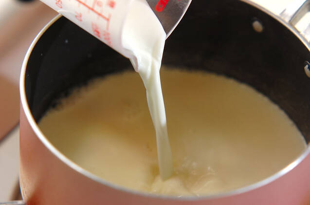 鍋に豆乳、砂糖を入れて中火にかけ、砂糖を煮溶かす。煮たったら火を止め、牛乳を加える。