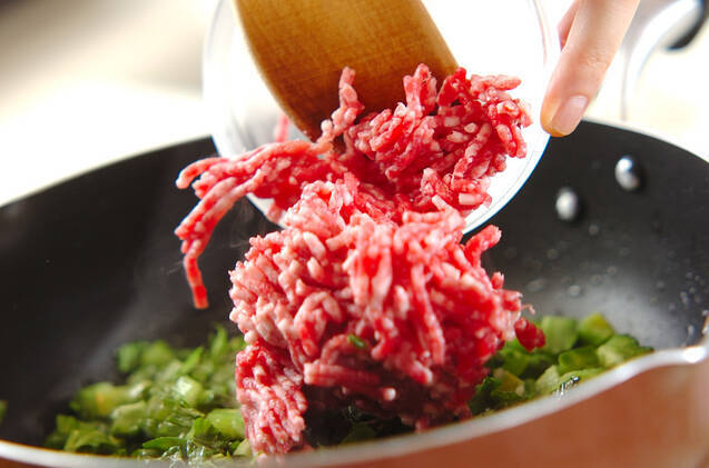 フライパンにオリーブ油、ニンニク、ショウガを入れて弱火で炒める。香りがたってきたら強めの中火でセロリ、ゴーヤを炒め、合いびき肉を加え炒め合わせる。