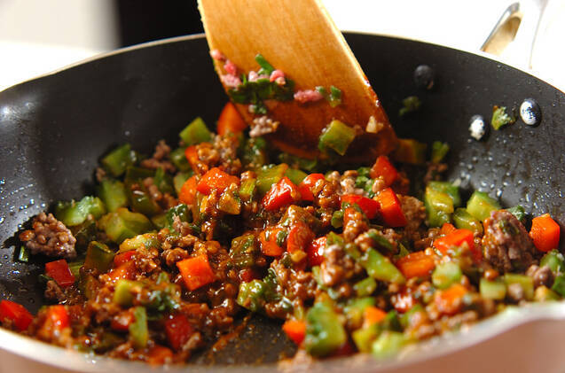 合いびき肉の色が変わったら赤パプリカを炒め合わせ、<調味料>の材料を加えて全体にからめるように炒め、塩コショウで味を調える。ご飯をよそった上にのせてカッテージチーズを散らす。