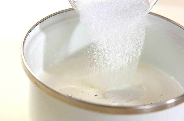 <パンナコッタ>を作る。鍋に生クリーム、牛乳、グラニュー糖、バニラビーンズ(サヤごと)を入れ、沸騰直前まで火にかける。