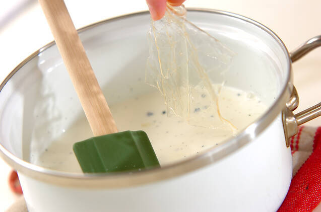 火を止めてもどした板ゼラチンを加え、溶けるまで静かに混ぜる。