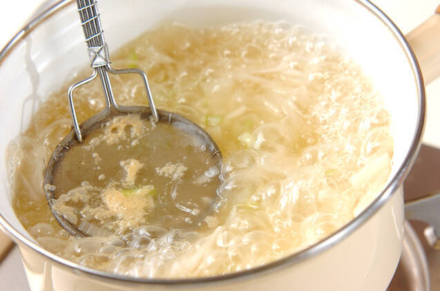 鍋に<スープ>を入れ強火にかけ、煮立ったらカブ、白ネギ、玉ネギ、ジャガイモを加える。再び煮立ったらアクを取って、野菜が柔らかくなるまで煮る。