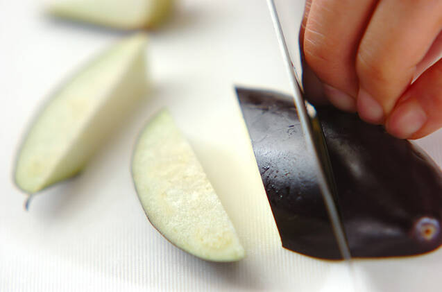 ナスはヘタを切り落として縦半分に切り、幅2cmの斜め切りにする。