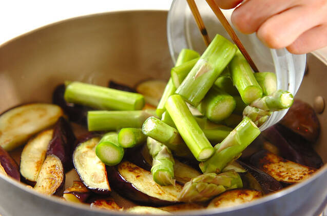 フライパンにサラダ油を強火で熱し、ナスが少ししんなりするまで炒め、グリーンアスパラも炒め合わせる。