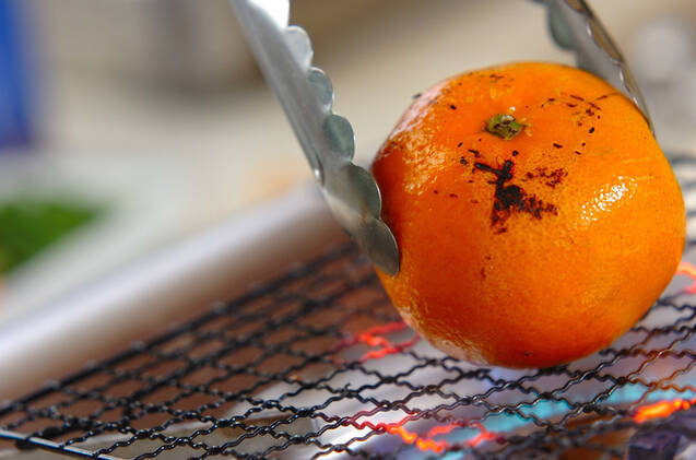 焼き網を熱し、みかんを転がしながらこげ目がつく位まで焼いて器に盛る。