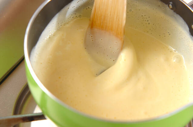 牛乳の半量を沸騰直前まで温め、 1のボウルに少しずつ混ぜながら加える。いったん鍋に戻し、木ベラなどで混ぜながら弱火にかけ、トロミがつくまで温める。