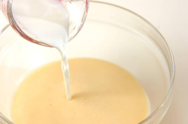 温かいうちにふやかしたゼラチンを加えて溶かし、網を通してボウルにあける。残りの牛乳を加えボウルの底を氷水にあてながらトロミがつくまで混ぜ合わせる。