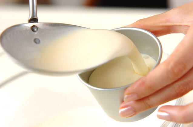 トロミがついたら生クリーム、バニラエッセンスを加えて混ぜ合わせ、冷やしておいたプリン型に流し入れ、1時間以上冷蔵庫で冷やし固める。お皿にひっくり返して、あればミントの葉を添える。