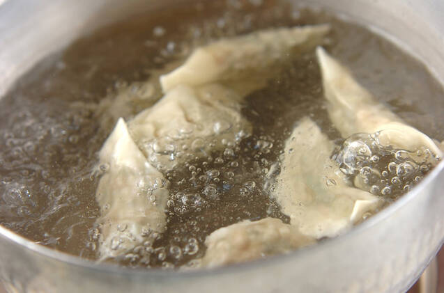 たっぷりのお湯を沸騰させ、餃子を1つずつ入れる。(たくさん入れ過ぎない様に注意しましょう。鍋の中で餃子が泳ぐ位の量が目安です)餃子が浮いてきたら分量外の1カップの水を加え(差し水)、弱火にし、再び煮立って餃子が浮かんでくるまでゆでる。