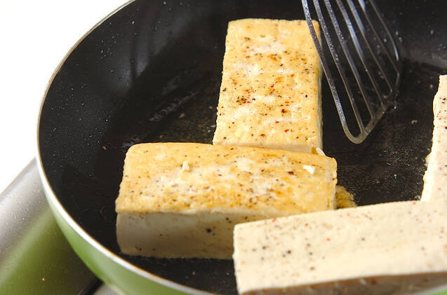 フライパンにサラダ油大さじ1を中火にかけ、木綿豆腐の表面に塩コショウを振り掛け、薄く焼き色がつくまで焼いて、しょうゆを加え豆腐に絡めて器に盛る。