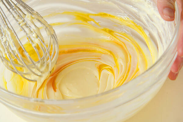 ボウルに室温に戻したクリームチーズを入れ、泡立て器でグラニュー糖と混ぜ合わせる。なめらかになれば牛乳、卵黄、バニラエッセンス、レモン汁を加えてよく混ぜ合わせる。