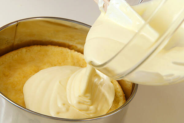 ジェノワーズを敷いた型に流し込み、型をトントンと少し落として大きな泡を除き、表面を平らにする。