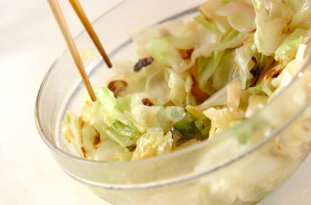 フライパンにゴマ油を入れて強火にかけ、キャベツをサッと炒め、<合わせ酢>に混ぜ合わせる。食べる直前まで漬けておき、器に盛り分ける。