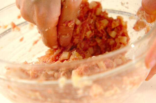 ボウルに<タネ>の材料を入れ、手でよく混ぜ合わせ、ひとくち大の俵型に形を整える。<衣>の小麦粉、溶き卵、パン粉を順につける。