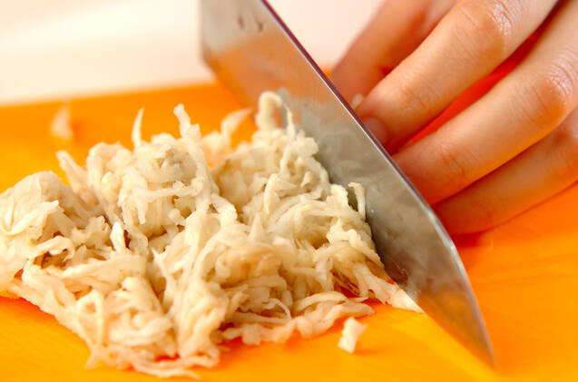 切干し大根は水で柔らかくもどし、水気を絞ってザク切りにする。