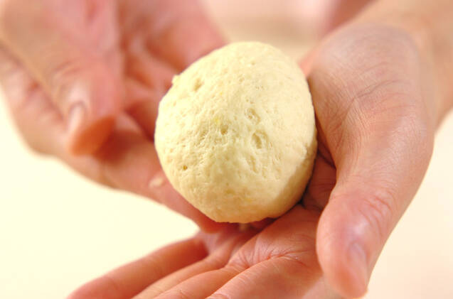4等分に生地を分けて丸め、ラップをかけて10分休ませる。