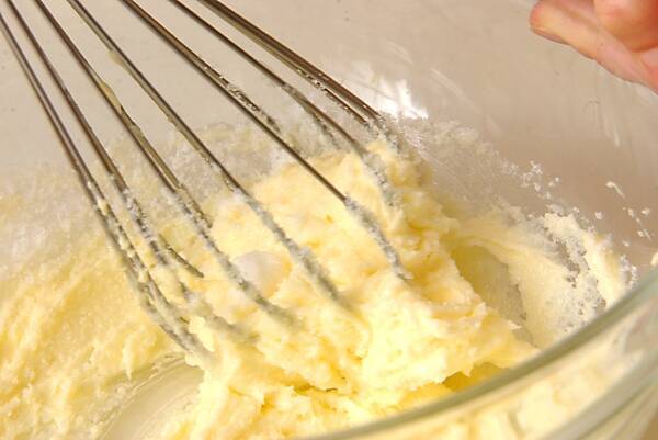<カボチャ生地>を作る。耐熱ボウルにバターを入れラップをして30~60秒電子レンジで加熱し柔らかくする。泡立て器でクリーム状に混ぜ、砂糖を3回位に分けて加えながらよくすり混ぜる。
