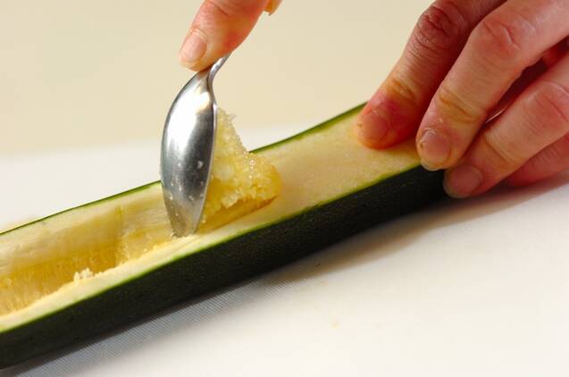 ズッキーニは竹串で全体を刺し、ヘタを切り落とす。縦半分に切り、小さめのスプーンで種の部分をこそげてくぼみを作る。
