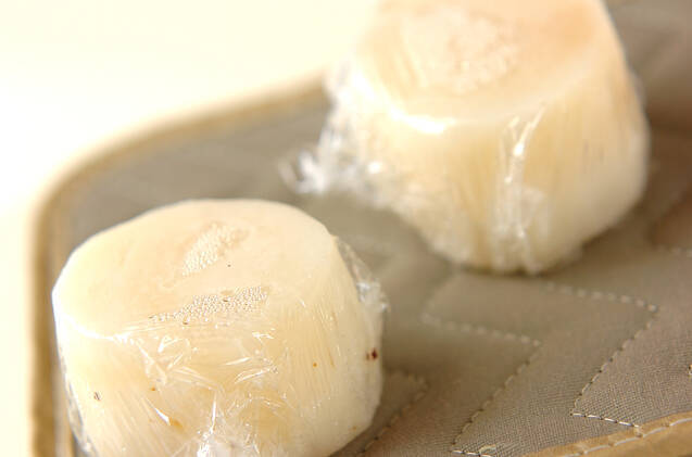 長芋は長さを半分に切って皮をむき、ラップで包んで600wの電子レンジで2分加熱する。水に取って粗熱が取れたら水気を拭き取る。