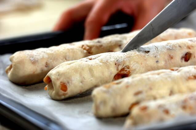 生地がひとまわり大きくなったら、生地の両端2cm残し、5mmの深さの切り込みを入れる。上から岩塩を振って、240℃に予熱しておいたオーブンで12~15分焼く。