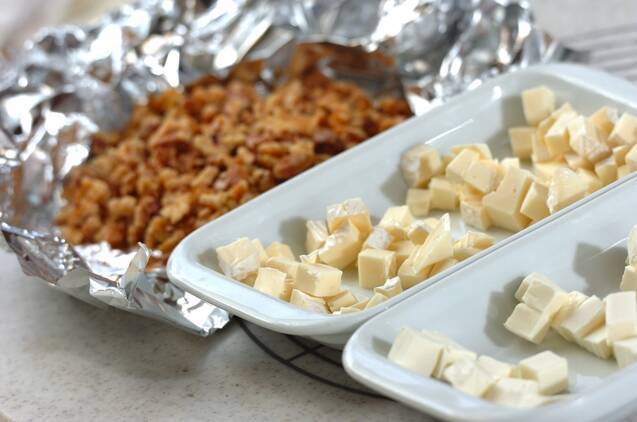 カマンベールチーズ、クリームチーズは1cm角に切っておく。