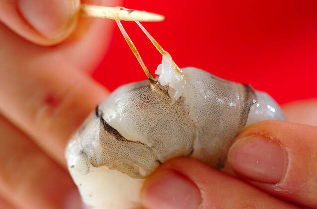 エビは殻と背ワタを取り、分量外の塩水で洗って水気を拭く。