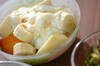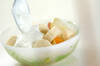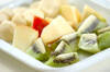 リンゴは皮ごときれいに水洗いして芯を取り、ひとくち大の乱切りにし、塩水に放つ。