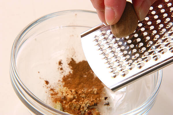 <マサラ> の用意をする。カルダモン、クローブは包丁の背などで叩いて砕き、ナツメグはすりおろし、シナモンパウダー、ジンジャーパウダーと合わせる。