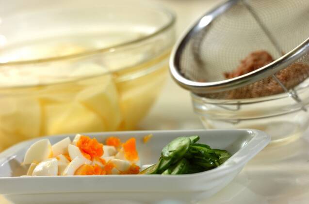 ジャガイモは皮ごときれいに水洗いし、皮をむいて芽を取り除く。ひとくち大に切り、水に放つ。